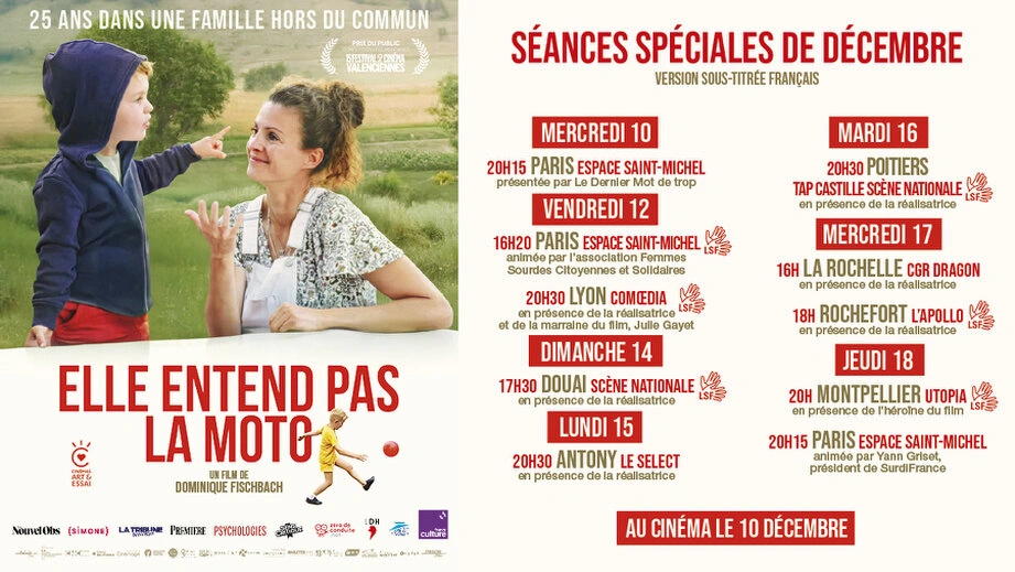 France Acouphènes est l'un des partenaires de la production du film "Elle entend pas la moto" de Dominique Fischbach qui sort dans les salles le 10 décembre 2025.
